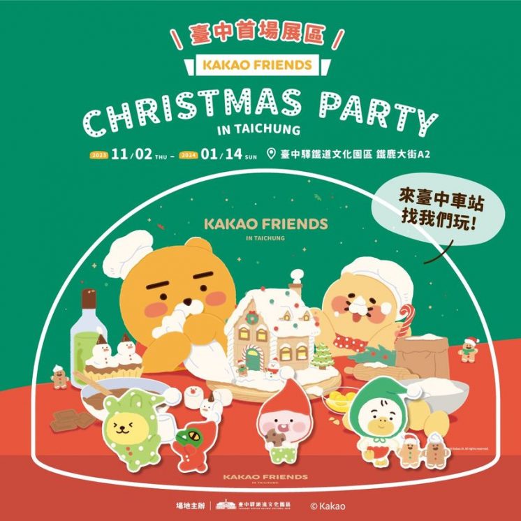 韓國超人氣 KAKAO FRIENDS 萊恩聖誕派對韓國超人氣 KAKAO FRIENDS 萊恩及周邊角色好朋友們,11/2開始,於臺中驛鐵道文化園區展開聖誕派對。 活動期間園區會結合火車旅遊、聖誕派對主題打造多個拍照區,並有雪白的夢幻薑餅等屋、蛋糕等繽紛裝置展覽讓大家盡情打卡;此外還有萊恩聖誕薑餅屋DIY等手作活動可以參與。萊恩粉絲們務必把握機會,來場與眾不同的聖誕派對! 時間:2023/11/2~2024/1/14